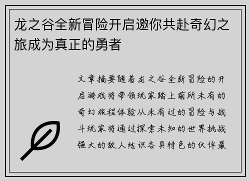 龙之谷全新冒险开启邀你共赴奇幻之旅成为真正的勇者