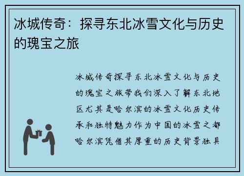冰城传奇:探寻东北冰雪文化与历史的瑰宝之旅